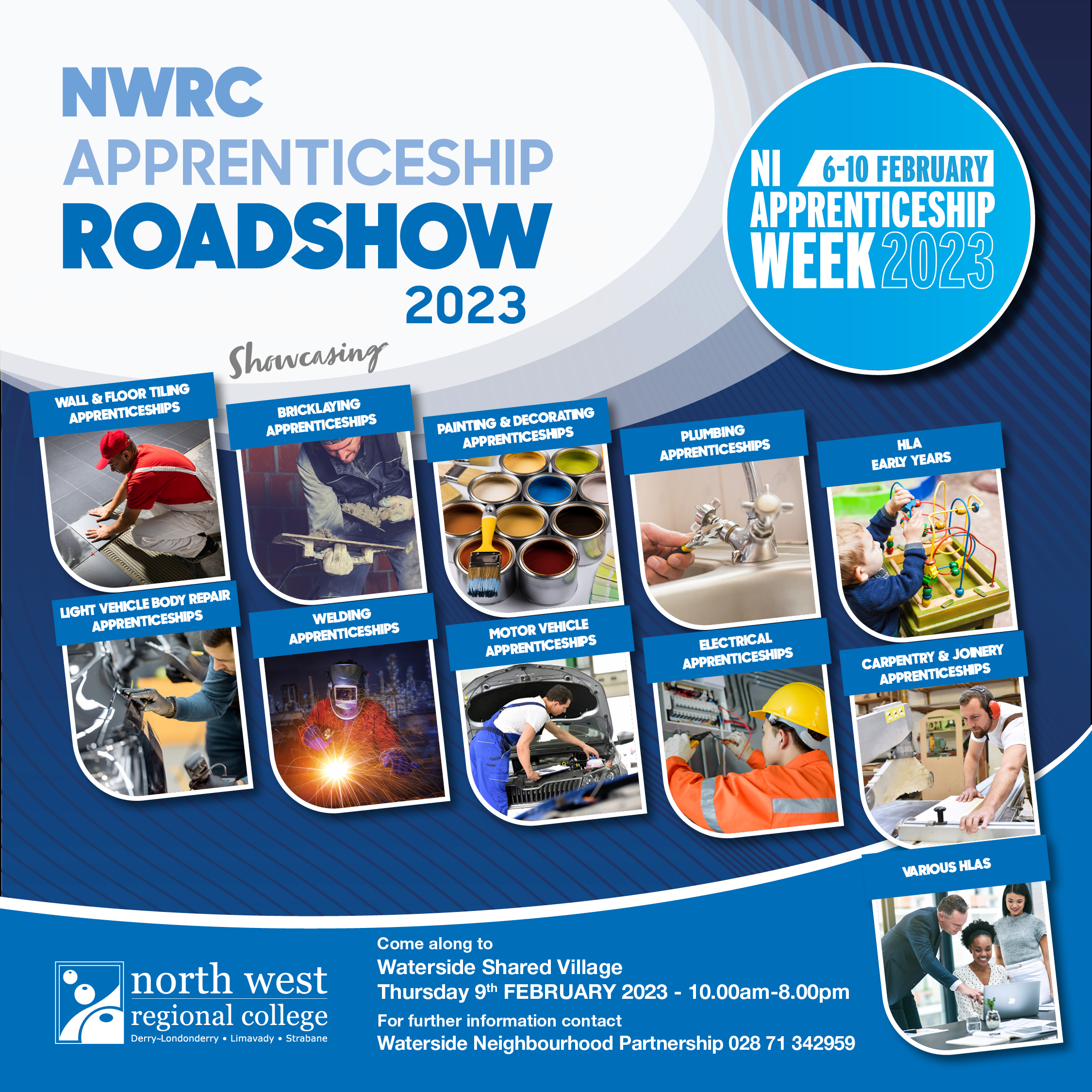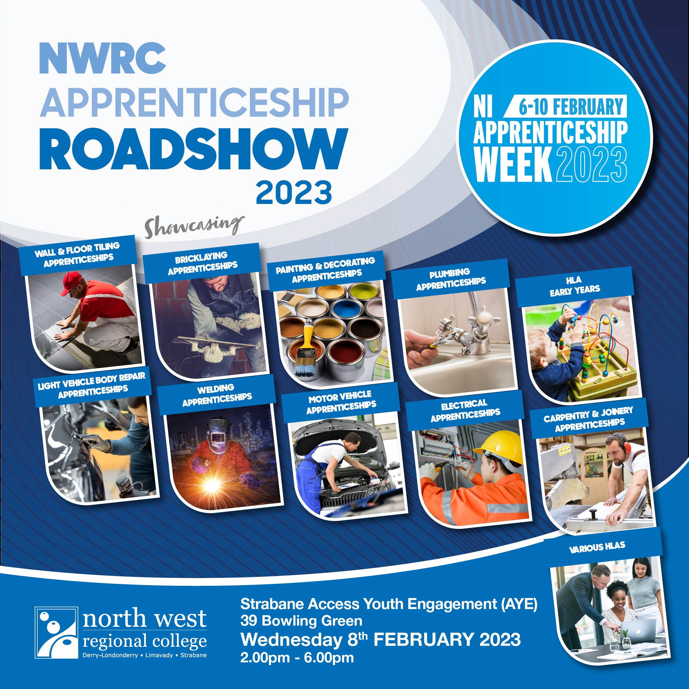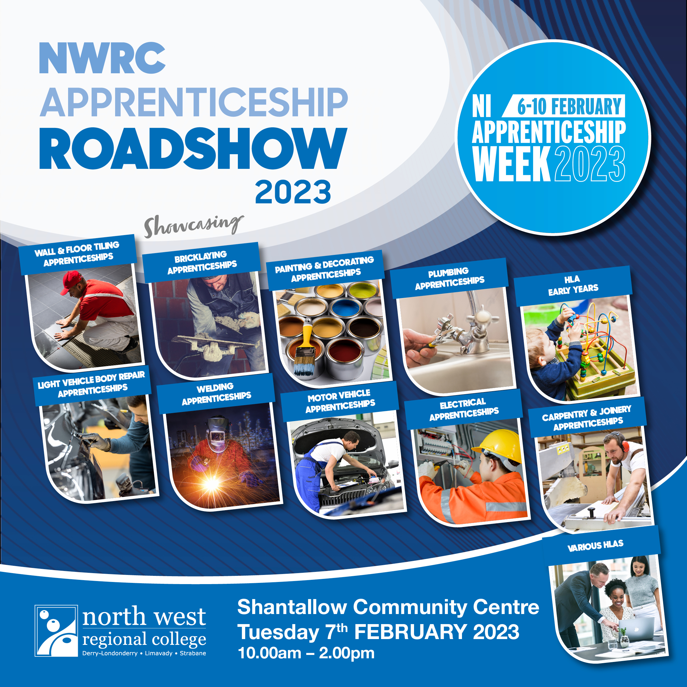 On Tuesday, February 7 from 10.30 a.m. – 3 p.m. NWRC will host an Apprenticeship Roadshow at Shantallow Community Centre showcasing apprenticeships in Painting & Decorating, Bricklaying, Mechanical Engineering, Wall & Floor Tiling, Welding, Electrical, Plumbing, Motor Vehicle, Light Vehicle Body Repair and various HLAs. NWRC will have practical demonstrations and curriculum staff available to answer questions you may have about the various Apprenticeship options available from L2 to HLAs at L5.