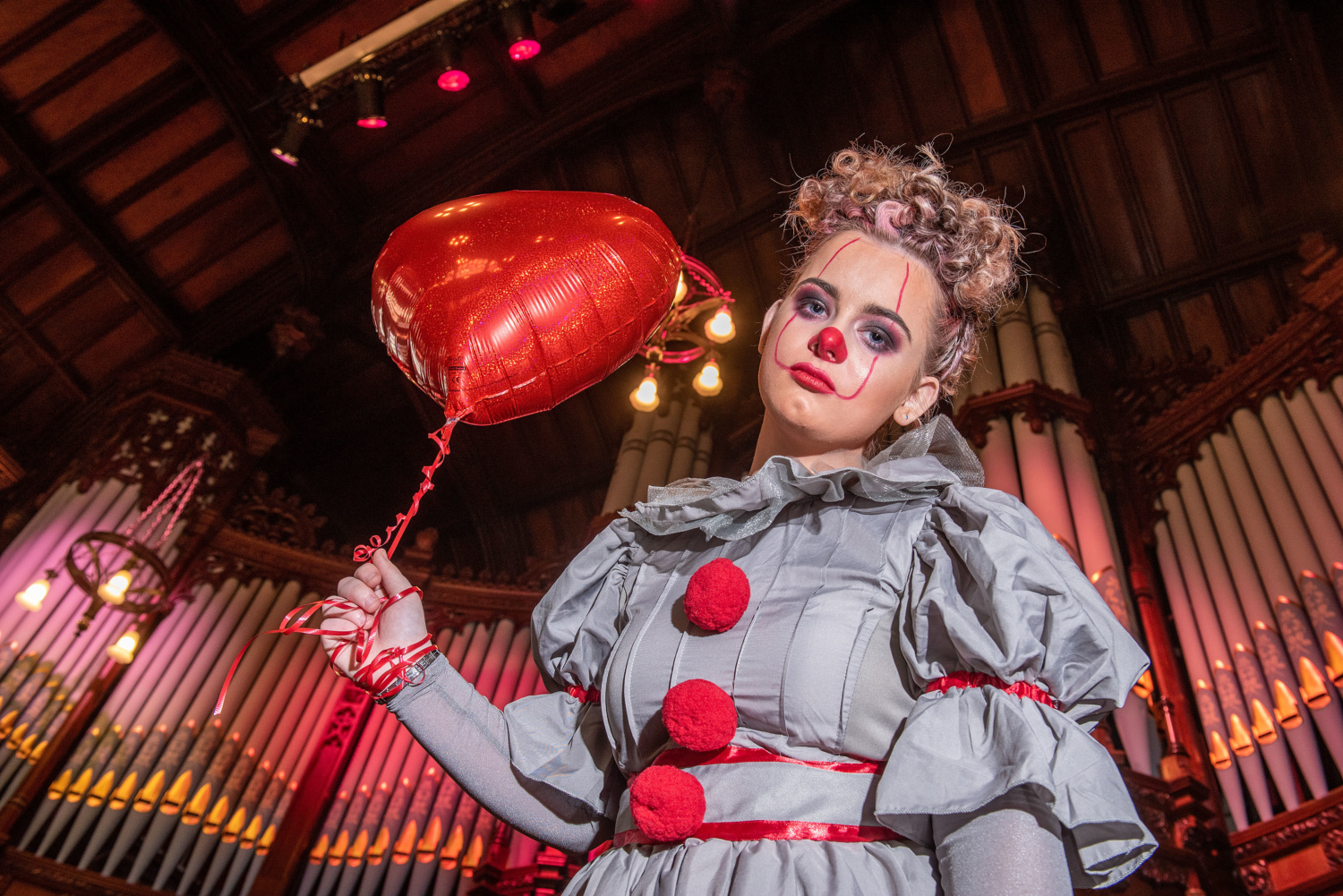 "I decided to focus on the work of Stephen King, and the more classical spooky characters that we associate with horror," she explains. "I picked Pennywise the Clown as my character - but a female Pennywise. My sister kindly volunteered to model which made things easier and I've dyed her hair deep pink.