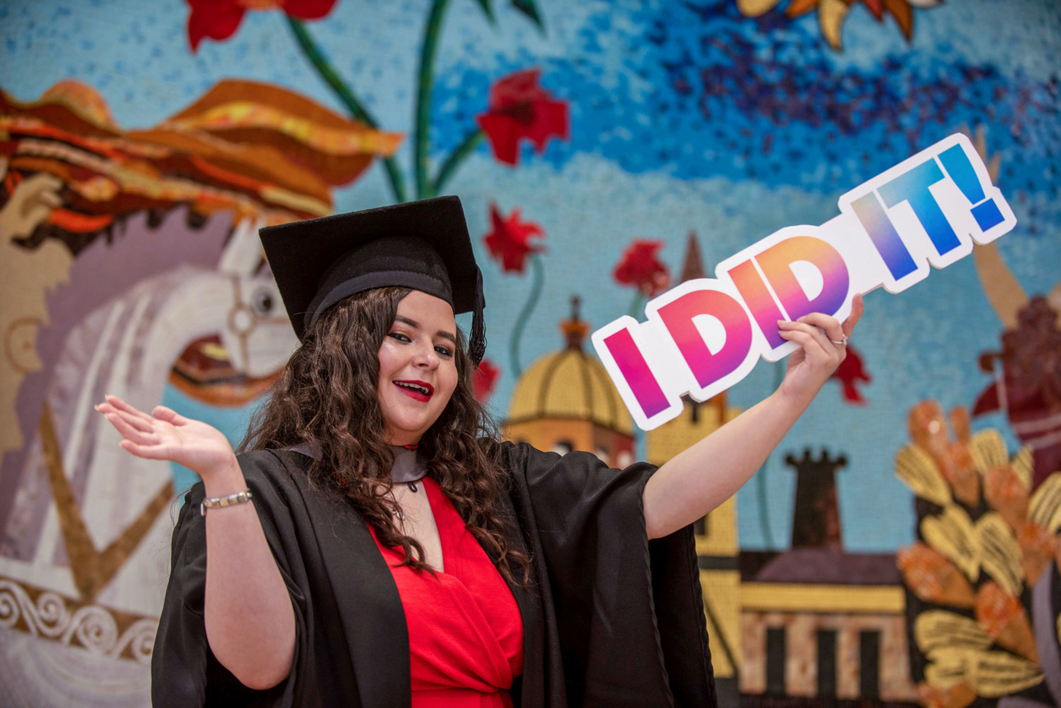 Mature female graduate taking a selfie while holding a 'I DID IT' photo prop